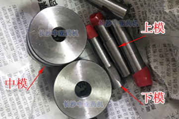 單沖壓片機的模具分為,上模、中模、下模,上模和下模均為長形圓柱體零件,上模比下模的長度要長,下模在圓柱體上有一個斜切口,而上模沒有斜切口,這是區分上模和下模的方法,如下圖: