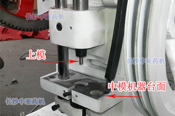 1.下模安裝:松開下模固定螺釘,將有斜切口的下模,切口朝向固定螺釘,插入下模模孔,稍稍緊固固定螺釘,不要鎖緊,等后面所有的模具都安裝到位了再鎖緊。為了使上模和下模都插入到位,在安裝中模之前,可用一塊木板放在上模和下模之間,旋轉右側壓片機手輪使左側的大齒輪安箭頭方向轉動,降低上模,使上模和下模都頂在在木板上,稍用力旋轉壓片機手輪,使頂力增大,把上模和下模都頂到要安裝到的位置,旋轉壓片機手輪使大齒輪安箭頭反方向小幅轉動,能拿去木板即停止轉動手輪,然后旋轉壓片機手輪使左側的大齒輪安箭頭方向轉動,使上模的芯桿上升到最高點。