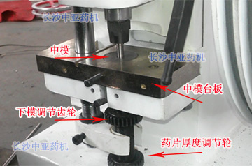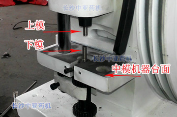1中模的安裝:將中模垂直放入中模臺板,中模端面與中模臺板在一水平面,緊固鎖緊螺釘,旋轉壓片機手輪使左側的大齒輪安箭頭方向轉動,使上模的芯桿上升到最高點,將中模臺板放在壓片機中模板臺面上,下模要對準中模模孔,裝上中模臺板緊固螺釘,不要鎖緊,要使中模臺板有移動的空間,降低上模,使上模也對準中模模孔,進入到中模模孔內,把上模、中模、下模的緊固螺釘都鎖緊,然后轉動壓片機手輪,使下模上升至最高點,調整中模臺板下的齒輪,