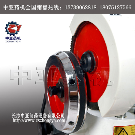 單沖壓片機的主件為流線型機身,整體鑄造而成,裝配精度高,材質優(yōu)良耐磨損,穩(wěn)定可靠。其上有主軸串連著三個心形凸輪,軸的右端裝有飛輪,附有活動手柄,可作手搖調整工作,軸的左端裝有從動齒輪,有電機,通過皮帶輪由三角帶傳動到小齒輪至從動齒輪,帶動主軸。主要工作過程分為:A.充填;B.沖壓成型;C.出片。三道程序連續(xù)進行,其每道程序均可調節(jié),適合各種元件及片劑的制造需求。
