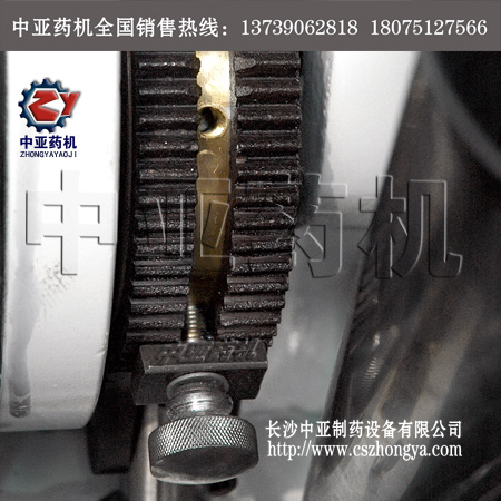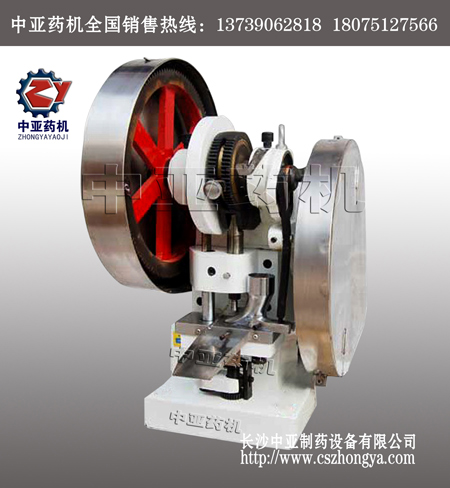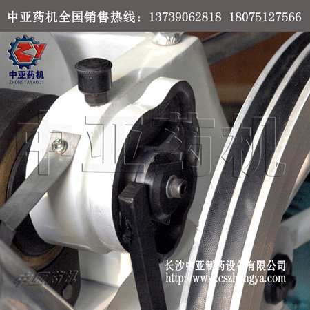 中草藥壓片機的主件為流線型機身,整體鑄造而成,裝配精度高,材質優良耐磨損,穩定可靠。其上有主軸串連著三個心形凸輪,軸的右端裝有飛輪,附有活動手柄,可作手搖調整工作,軸的左端裝有從動齒輪,有電機,通過皮帶輪由三角帶傳動到小齒輪至從動齒輪,帶動主軸。主要工作過程分為:A.充填;B.沖壓成型;C.出片。三道程序連續進行,其每道程序均可調節,適合各種元件及片劑的制造需求。